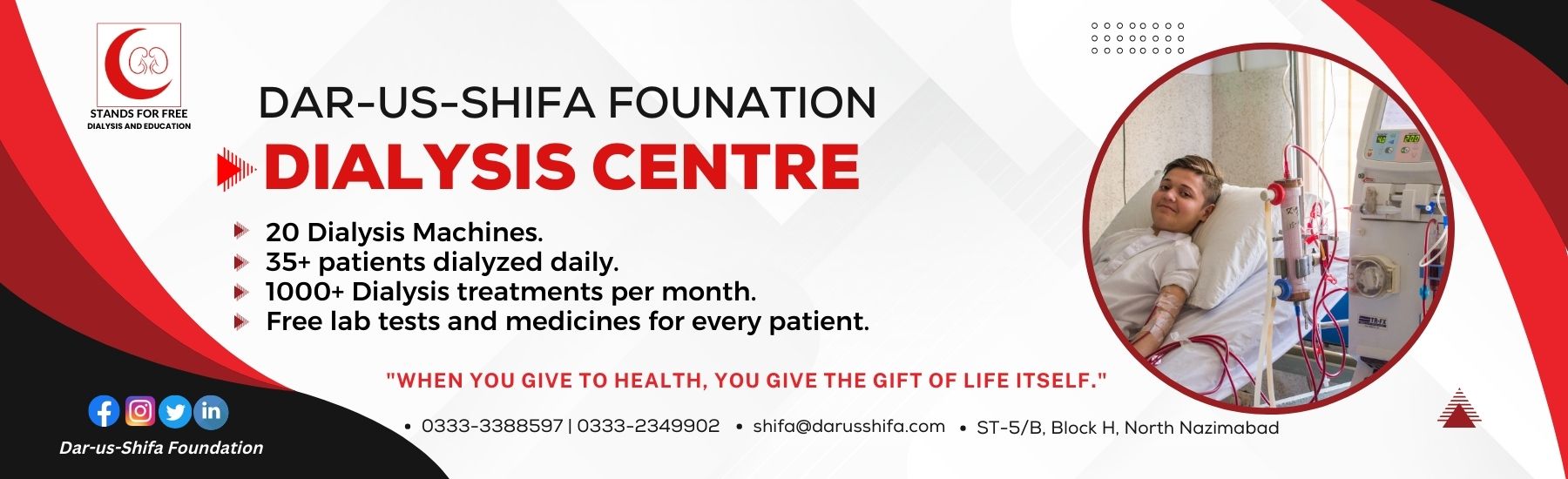 Dar us Shifa Dialysis Center operating since 2005 is equipped with 21 modern Dialysis Machines providing Free dialysis sessions to everyone. Dialysis to patients is carried out in peaceful air conditioned environment. The Centre incurs monthly expenses of around Rs3.5 Million which is covered by donations from individuals and institutions within Pakistan and overseas. This is an ongoing process requiring a generous support in a regular basis. Besides regular donations, zakat funds are also accepted to finance the cost of dialysis of patients eligible for zakat.